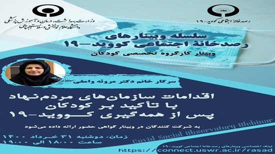از سلسله وبینار های رصدخانه اجتماعی کووید 19 در کار گروه تخصصی کودکان، وبینار "اقدامات سازمانهای مردم نهاد با تاکید برکودکان" با سخنزانی خانم دکتر مروئه وامقی رئیس مرکز تحقیقات مدیریت رفاه اجتماعی دانشگاه علوم توانبخشی و سلامت اجتماعی روز دوشنبه 31خردادماه 1400 ساعت 18 الی 19 برگزار می شود.