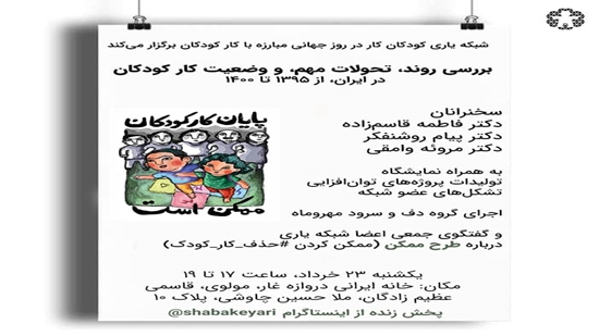 شبکه یاری کودکان کار با همکاری مرکز تحقیقات مدیریت رفاه اجتماعی در مورخ یکشنبه – 23 خردادماه به مناسبت روز جهانی مبارزه با کار کودکان، به بررسی " روند تحولات مهم و وضعیت کار کودکان در ایران، از 1395 تا 1400 " پرداخت .