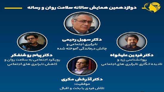 «آینده در آيینه نابرابری‌ها» موضوع چهارمین پانل دوازدهمین همایش سالانه سلامت روان و رسانه «بیماری‌های روان و هزینه‌های درمان» بود که با حضور سهیل رحیمی، پیام روشنفکر، آذرخش مکری و فردین علیخواه در روز سه‌شنبه دوم اسفند از ساعت ۱۰:۴۵ تا ۱۲:۴۵ برگزار شد.