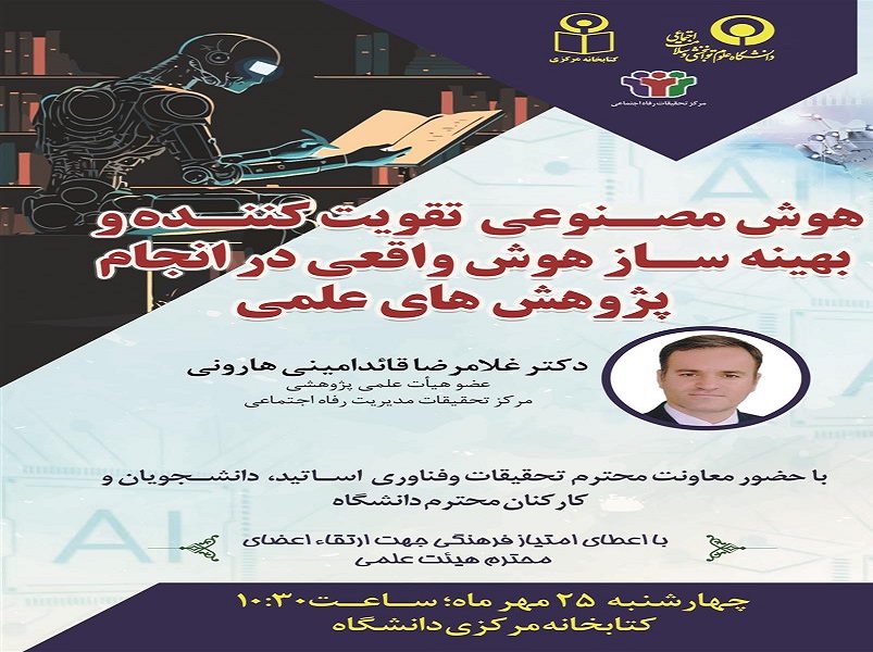 برگزاری کافه کتاب این هفته در کتابخانه تحت عنوان : هوش مصنوعی تقویت کننده وبهینه ساز هوش واقعی در انجام پژوهش های علمی در روز چهارشنبه 25 مهرماه توسط آقای دکتر غلامرضاقائدامینی عضو هیئت علمی مرکز تحقیقات مدیریت رفاه اجتماعی