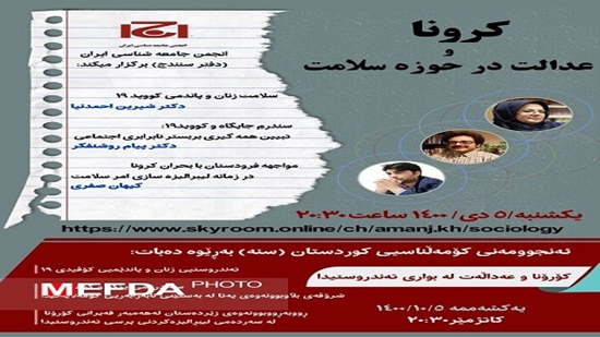 انجمن جامعه شناسی ایران برگزار نمود: وبینار : کرونا و عدالت در حوزه سلامت این وبینار در شهر سنندج در تاریخ 5 دی ماه برگزار شد. اطلاعات بیشتر در تصویر فوق :