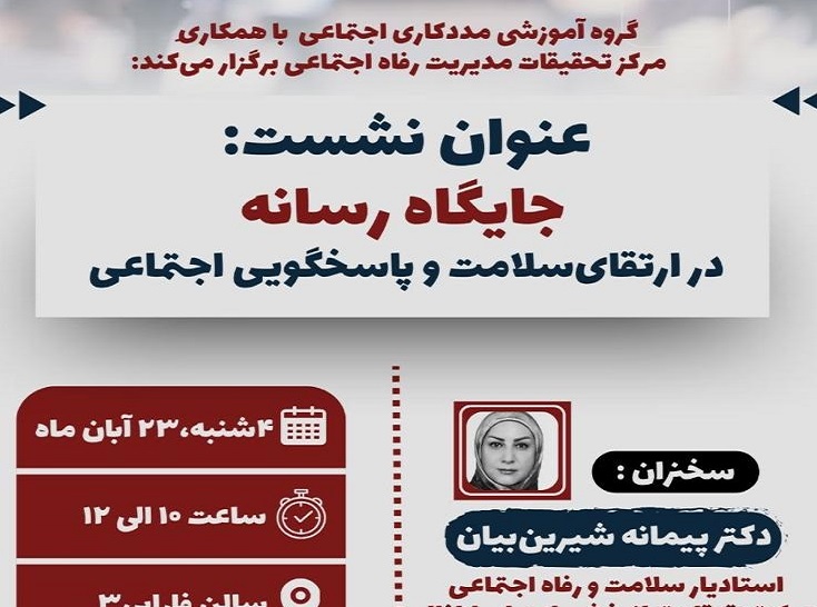عنوان نشست: جایگاه رسانه در ارتقاء سلامت وپاسخگویی اجتماعی روز چهارشنبه سالن فارابی 3 ساعت 10